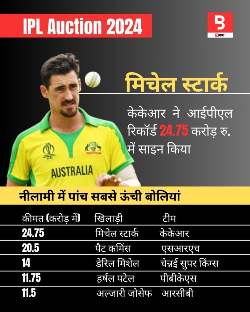 - मिशेल स्टार्क – कोलकाता नाइट राइडर्स – 24.75 करोड़ रुपये
